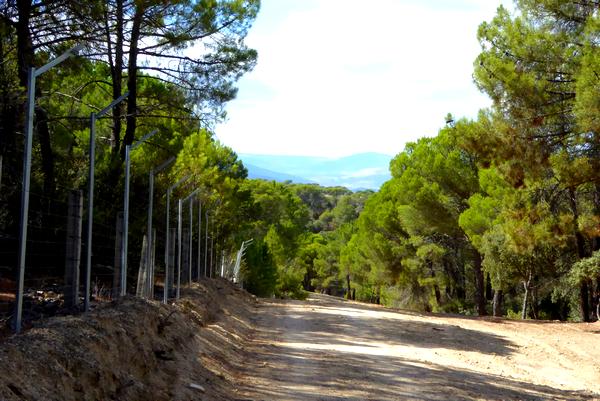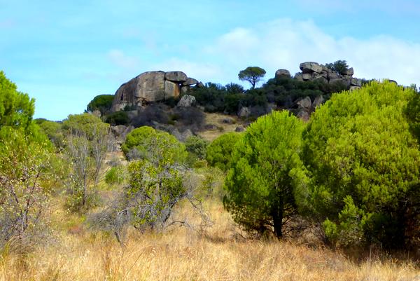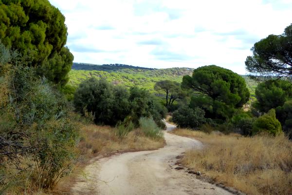 Je fais une bonne pause sous un de ces grands pins qui ressemblent aux pins Laricio qu'on trouve en Corse. Puis je reprends cette longue piste montante assez fatiguante mais la beauté de l'environnement est une bonne compensation ! Il y a des propriétés adossées à une masse de rochers aux formes étranges... Je traverse une Nationale et je retrouve sur plusieurs kilomètres cette piste qui semble n'avoir pas de fin, avec un balisage inexistant ! J'arrive à un point haut ce qui permet une belle vue sur les montagnes alentour, puis petite route goudronnée avec un panneau indiquant Valdeiglesias à 8 km.