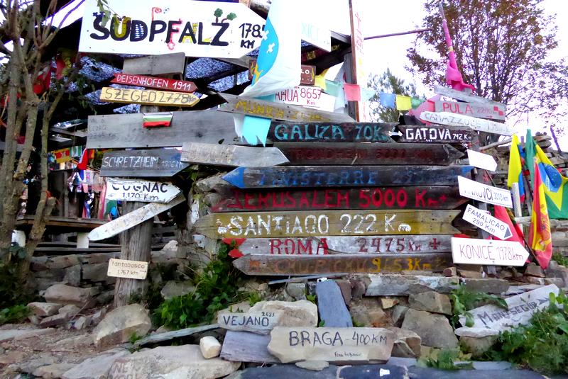 Les panneaux indicateurs qui font rêver devant l'albergue de Manjarin