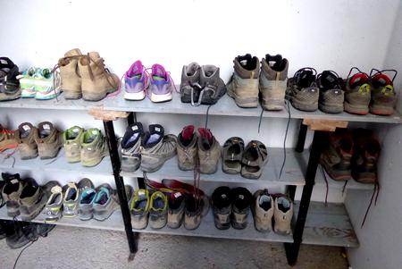 Les chaussures bien alignées à l'entrée de l'Albergue