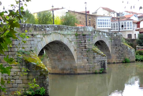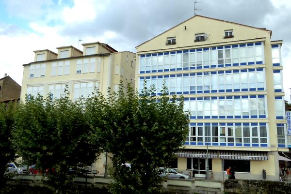 J'arrive à Monforte un peu après midi. Je traverse une partie de la ville avant d'arriver au Puente Viejo à côté duquel se touve l'Hostal Puente Romano où j'ai réservé une chambre. Je bois un verre, puis après les formalités, je monte dans ma chambre qui donne sur le Puente Viejo et le Rio Cabe.