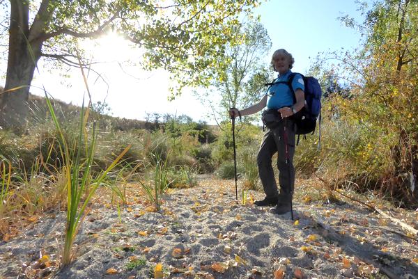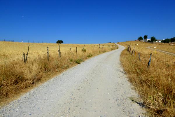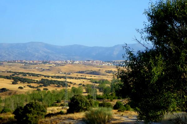 Je quitte l'Hostal à 7h15 et je prends mon petit-déjeuner dans un bar à côté. La sortie de Tres Cantos se fait sans problème en suivant à l'envers les indications du guide. Après le franchissement par une passerelle d'une route à grande circulation, je marche un moment sur une piste cyclable que je quitte pour descendre par un sentier un peu accidenté dans un vallon traversé par de nombreux arroyos à sec. A 9h il fait déjà plus de 30°, mais cette partie du chemin est largement ombragée par des peupliers.
