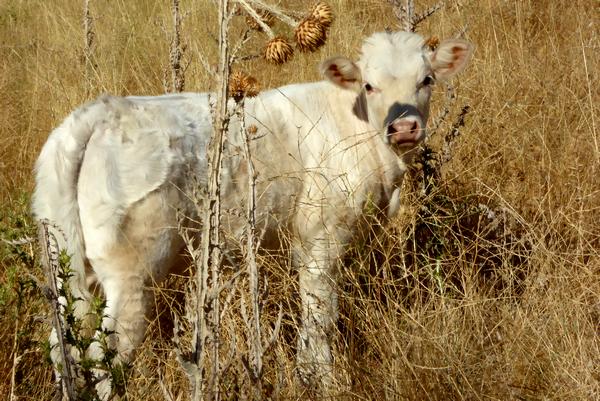 Après une pause pour rafraîchir le gosier et les pieds j'aborde une longue piste sablonneuse et caillouteuse qui fait des zig-zag au milieu de ce qui devait être au printemps de belles prairies, et malgré tout au milieu de ces étendues d'herbe grillée, il y a quelque troupeaux de vaches qui peuvent s'abreuver grâce à des citernes alimentées par des camions.