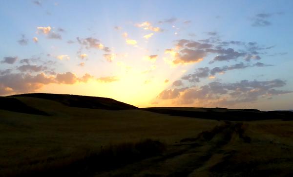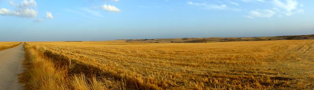 Je quitte l'Albergue à 6h30. Je vais suivre une longue piste qui s'allonge pendant plusieurs kilomètres au milieu de grandes étendues céréalières, itinéraire propice à la déclamation des poèmes...
