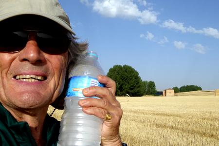 A la sortie du 2ème pueblo traversé, Los Huertos, je m'arrête pour faire une pause dans un square, un homme vient à ma rencontre et me propose une bouteille d'eau glacée que j'accepte volontiers, car il commence à faire très chaud ! Après l'avoir passée sur toutes les parties de mon corps et même sur les pieds, je repars en la gardant sous le bras pendant un moment avant de la déposer au pied d'un ermitage.