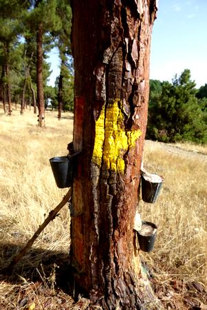 La sève des pins qui s'écoule est recueillie dans ces godets