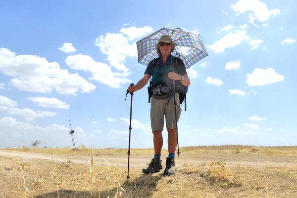 Les derniers 8 kilomètres par cette forte chaleur sur ces pistes interminables sont éprouvants... je vais suivre les conseils de mon ami Gilbert et ouvrir mon parapluie pour me protéger un peu des rayons brûlants du soleil...Heureusement par moments il y a quelques nuages et un peu de vent ce qui est bien appréciable !