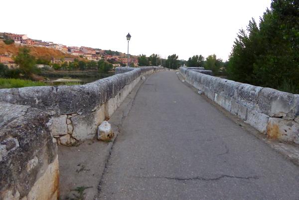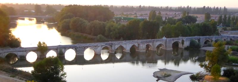 Je prends le bus à 7h20 à Valladolid pour Simancas-Puente où je retrouve le Camino et les flèches... Je traverse ce joli pueblo d'où j'ai une belle vue sur le pont médiéval et le Rio Duero que le lever de soleil pare de belles couleurs.
