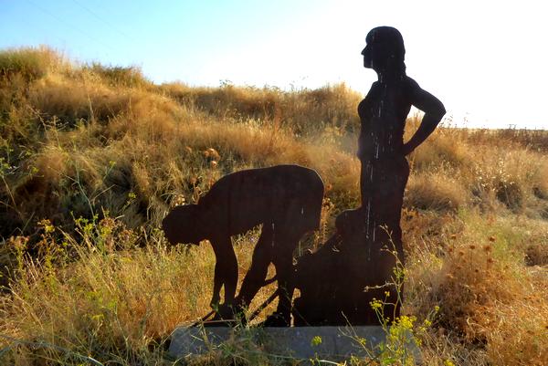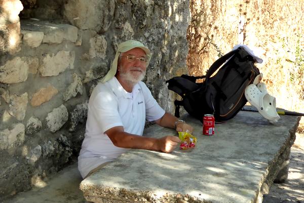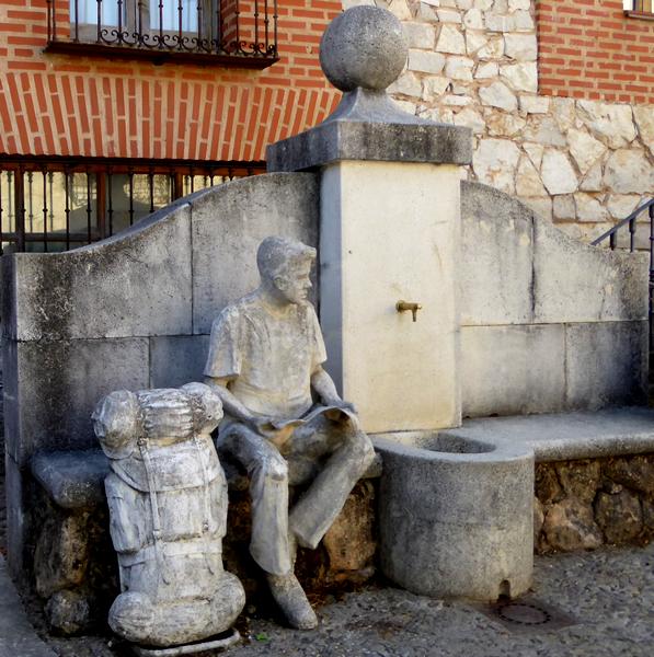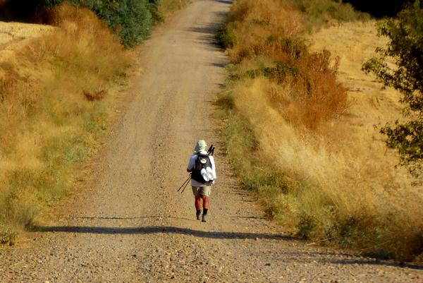 Je m'arrête à la sortie de la localité dans un bar pour prendre mon petit déjeuner. Ensuite le chemin est vallonné, serpentant au milieu de terres agricoles le long de pistes caillouteuses. Je rencontre un Espagnol, Juan, avec lequel j'ai quelques échanges et je le laisse partir, car pour moi, c'est l'heure de mes déclamations quotidiennes...Je le retrouve un peu plus loin assis devant une casita de berger, à l'ombre, en train de se restaurer.
