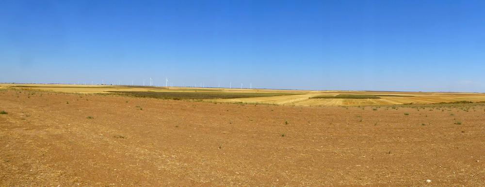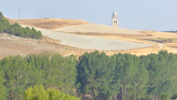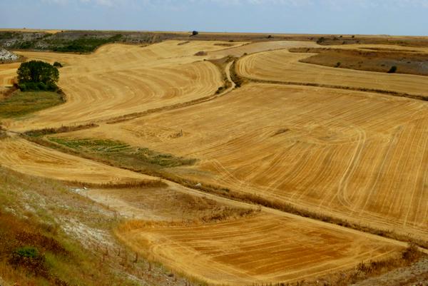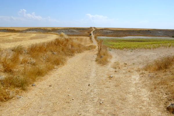 Il y a ensuite une piste empierrée montante qui débouche sur un plateau que je vais traverser en empruntant à nouveau ces pistes caillouteuses qui s'enfoncent entre ces immensités de culture où ne subsistent en cette fin d'été que des terres grillées par le soleil avec les tiges coupées ras des céréales qui devaient au printemps onduler comme les vagues de la mer sous les brises du matin...