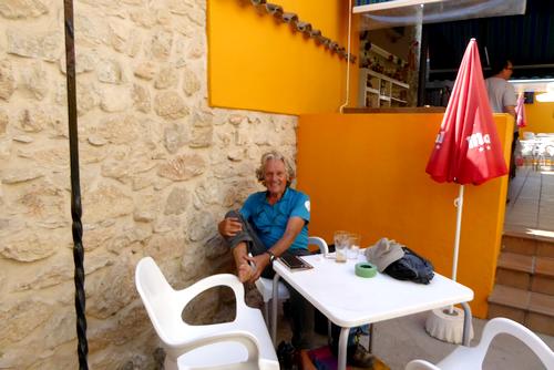 Le soir je vais dîner dans un bar sur la place de la mairie avec au menu : Soupe de lentilles, Salade avec tomates, concombres et olives, un demi lapin, une bouteille de bon vin de la région, et un verre de Pacharan pour 11 Euros !!!