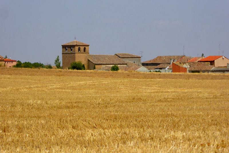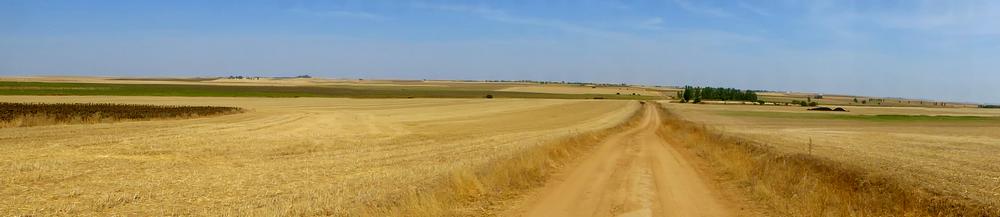 Je quitte l'Albergue à 6h15. Je traverse la ville et vais au Bar Riosol prendre mon petit-déjeuner. Ensuite, j'emprunte un chemin agricole qui suit la N 601 pendant quelques kilomètres avec quelques passages herbeux au milieu des champs de céréales que le soleil d'été a jaunis et grillés !