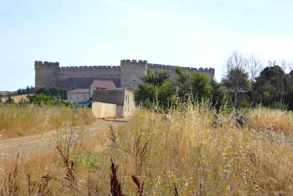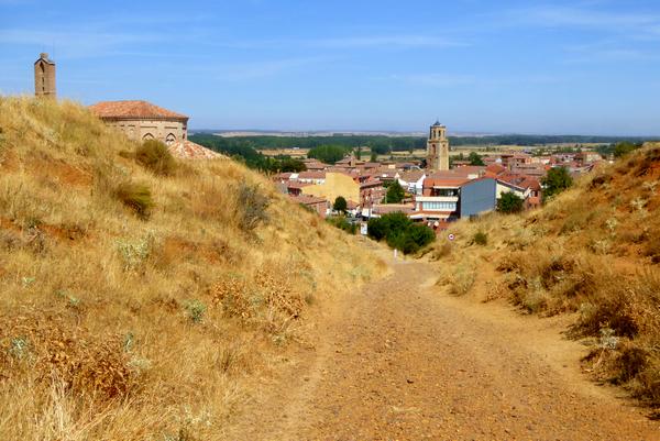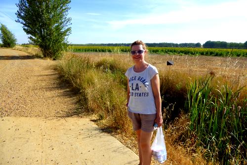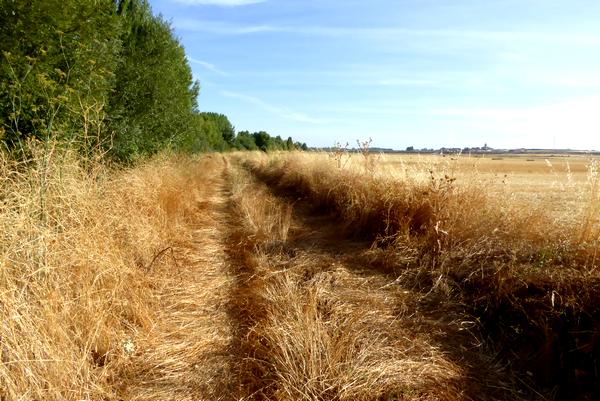 Jusqu'à Grajal de Campos, le chemin longe le Rio Valderaduey au milieu d'herbes hautes et d'une végétation assez dense qui rend un peu difficile la marche. Arrivé dans cette localité, je trouve le Bar fermé et heureusement une dame m'indique une tienda ouverte où je peux acheter un Coca pour me rafraîchir le gosier car la chaleur est toujours au rendez-vous ! Une jeune femme voyant que je cherche dans quelle direction aller, me propose de m'accompagner jusqu'à la sortie de ce pueblo pour me mettre sur le bon chemin, le Camino de la Peregrina qui file tout droit vers Sahagun. Quelques échanges, salutations et remerciements à cette jolie espagnole !