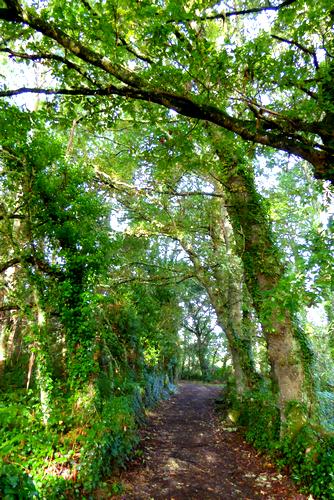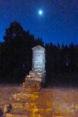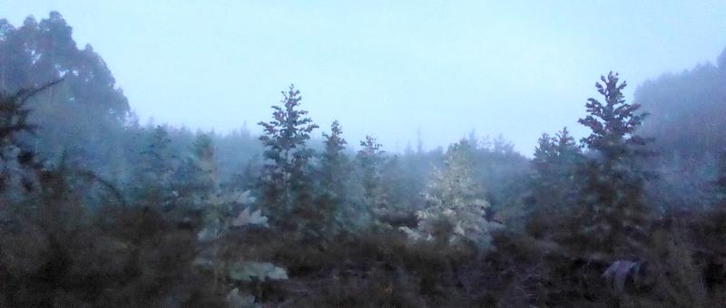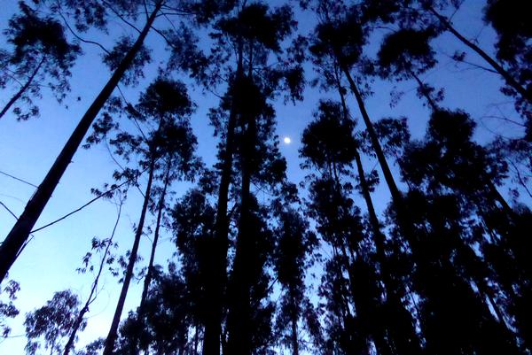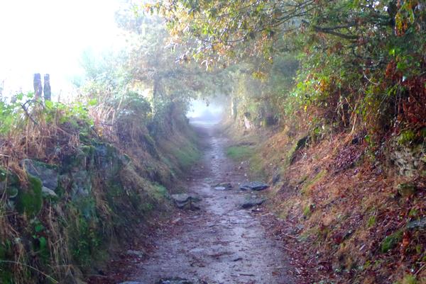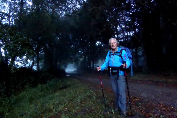 Je quitte l'Albergue à 6h en passant par une fenêtre, car les portes sont fermées ! Il fait nuit, le ciel est clair. Je marche 2 kilomètres le long d'une petite route puis je me retrouve au milieu d'une forêt dans le grand silence de la nuit... Le dernier quartier de lune joue à cache-cache au milieu des frondaisons des grands arbres et le ciel est constellé d'étoiles...J'apprécie de marcher à ce moment de la nuit juste avant les premières lueurs de l'aube.