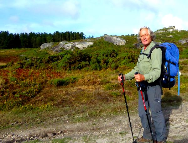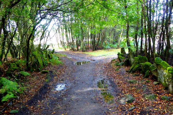 Ensuite, le décor change. Je grimpe sur un plateau en suivant des pistes qui s'étirent au milieu d'une lande couverte de fougères et de genêts, et par endroits il y a des rochers rasants qui jalonnent le chemin. Le temps est beau, le soleil a émergé de derrière les grands arbres et je n'ai pas eu de brouillard. L'itinéraire est agréable, même lorsqu'il emprunte une route peu circulante (LU-P-2119).