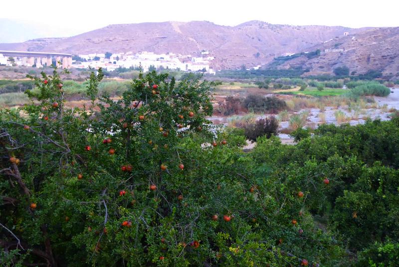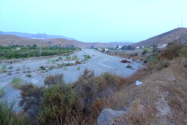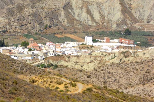 Après avoir traversé la route, ça grimpe un peu sur 100-200m, puis c'est un sentier très, très raide qui descend dans un autre vallon. Là il y a un embranchement, d'un côté pour cyclistes, de l'autre pour marcheurs. C'est celui-là que j'ai suivi. C'est alors une longue, longue piste qui grimpe longtemps jusqu'à un sommet, et ce n'est pas fini, il y a encore. quelques bons dénivelés et il fait de plus en plus chaud. Heureusement le balisage est correct. Enfin, après une descente assez raide, j'arrive dans le pueblo Alhabia, où je prends un temps de repos dans une construction abandonnée, puis au centre du village, je m'arrête dans un bar boire un Coca bien glacé et manger quelques olives et du jambon.
