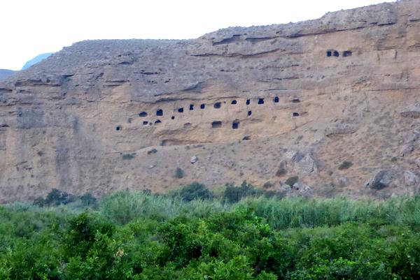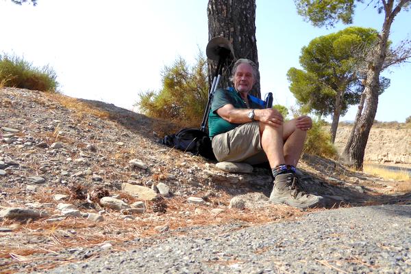 J'arrive dans un vallon où je rerouve un rio assez large que je vais quitter au niveau d'une vaste orangeraie pour grimper dans les collines sur un chemin aride et caillouteux. J'arrive à un col et je redescends dans un vallon désolé... A nouveau les balises m'indiquent de reprendre une piste qui va grimper jusqu'à 450m. J'arrive à une route goudronnée bordée de quelques pins qui font une bonne ombre...C'est le moment de faire une pause. Heureusement j'ai prévu d'emporter assez d'eau, aussi je peux me rafraîchir le visage et boire suffisamment. Je pensais que le plus dur était fait, mais non, le plus dur est à venir...