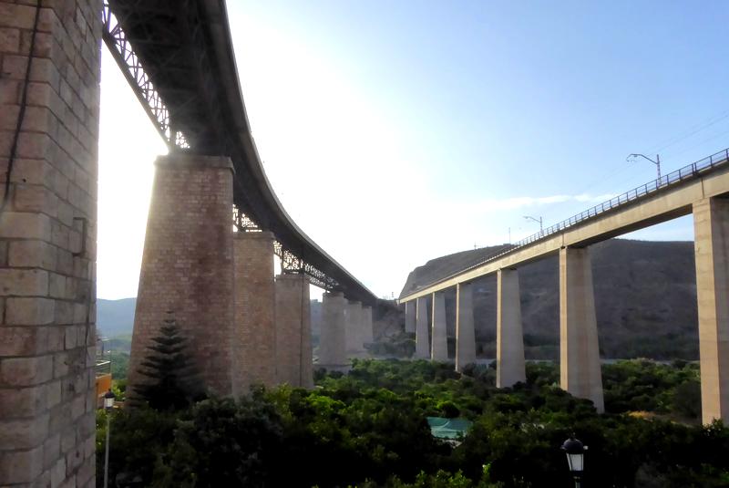 Au lever du jour, il y a un peu de fraîcheur qui est bien agréable avant la chaleur que l'on sent peu à peu monter... Je m'arrête à Santa Fé de Mondujar dans un bar boire un cafe con leche, je me déchausse pour rafraîchir mes pieds, je fais le plein d'eau fraîche avec des glaçons. Ensuite une petite route en montée m'emmène jusqu'à un monument. De là, j'ai un beau point de vue sur 2 ponts, l'un pour les trains construit par Gustave Eiffel et l'autre plus récent pour les voitures.