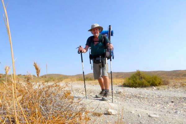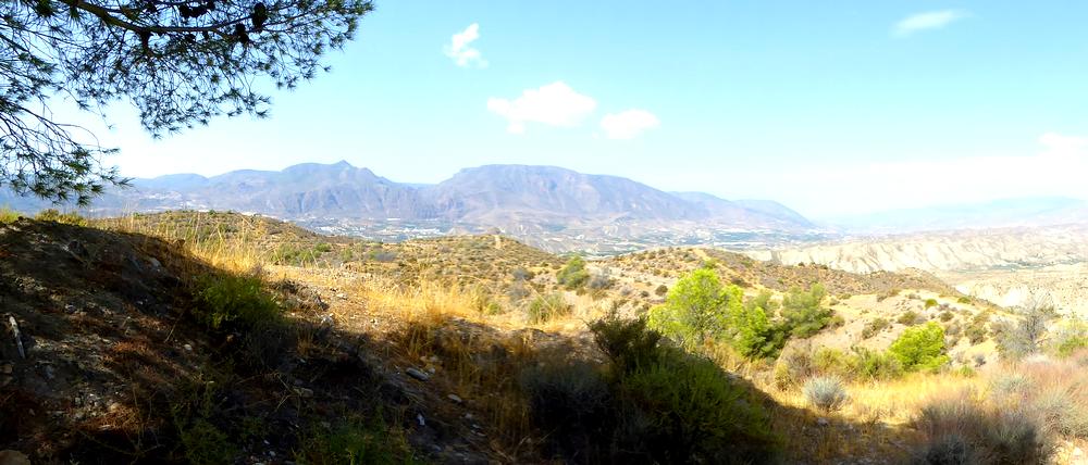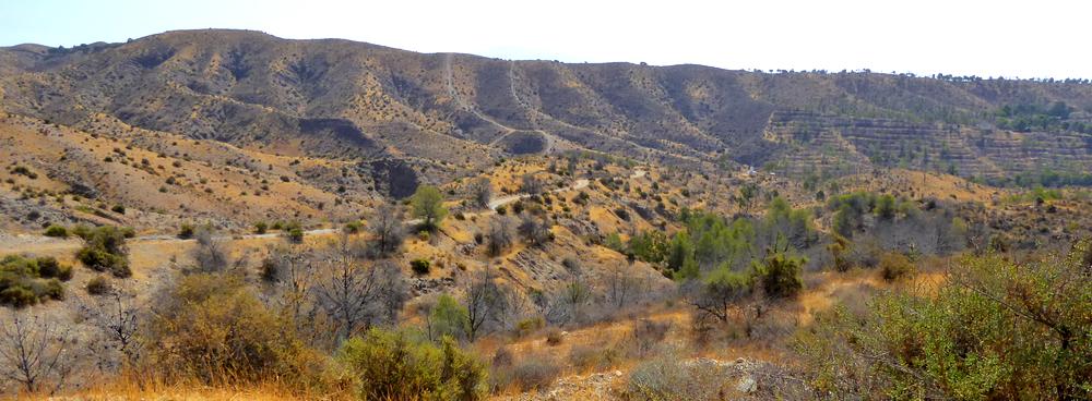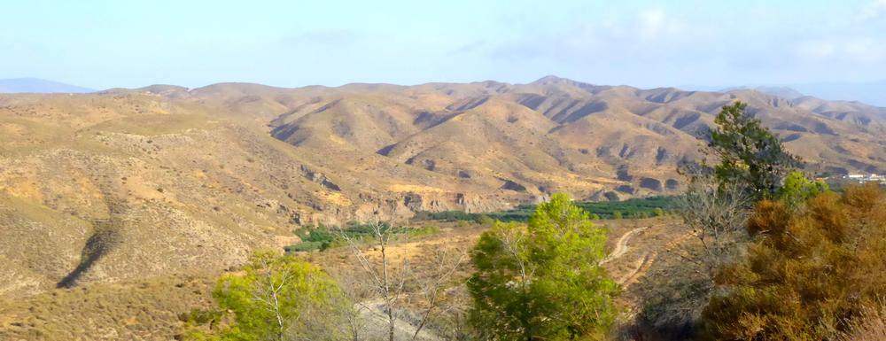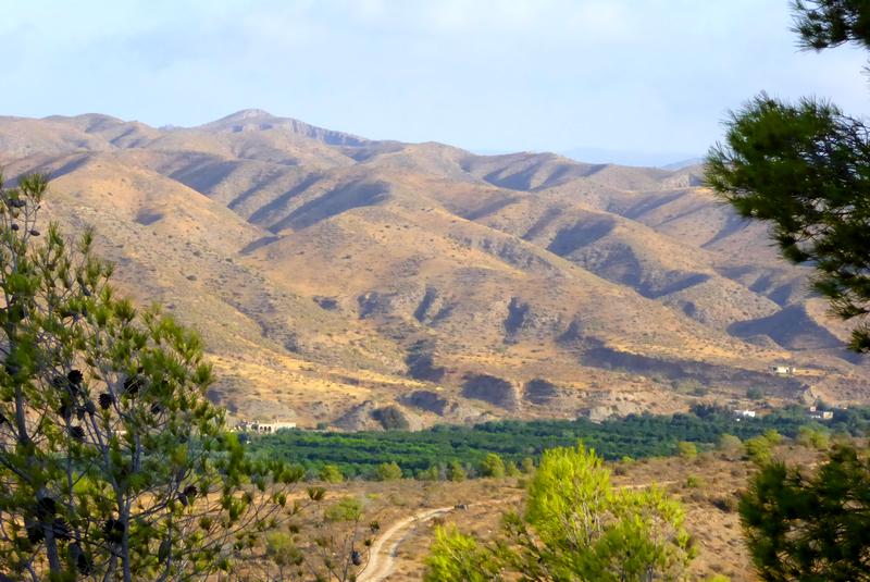 aller de vallons en sommets sous une chaleur avoisinant les 40 degrés. Le Chemin va suivre pendant un temps le GR140 le long d'une petite route goudronnée avec d'un côté la Sierra Alhamilla et de l'autre la Sierra Nevada.