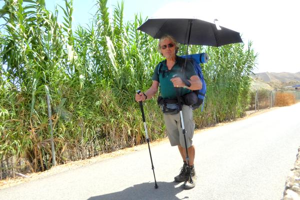 Il reste 8 km. Avant de partir je demande de l'eau et des glaçons, puis j'installe mon parapluie/parasol sur le sac pour me