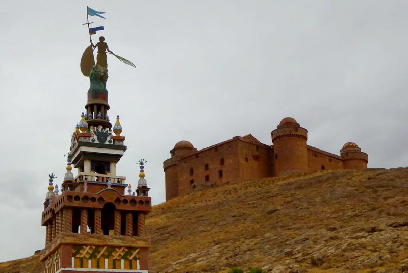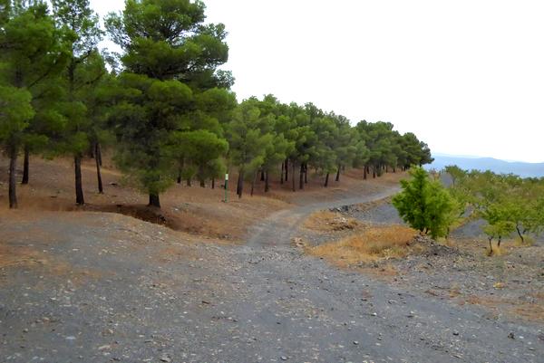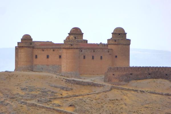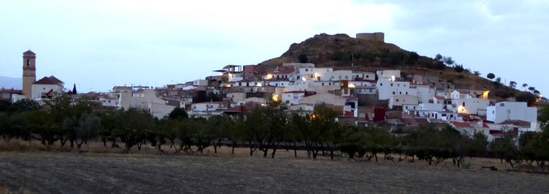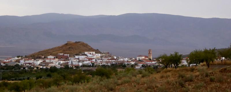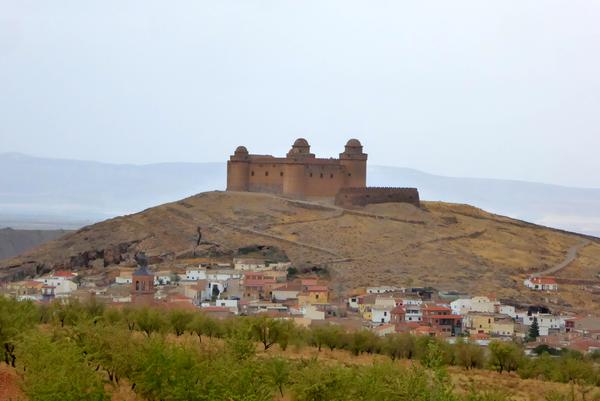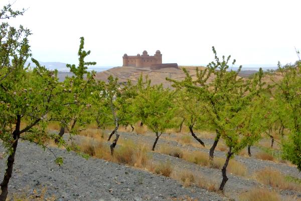 La suite est toujours aussi agréable en suivant des chemins de terre au milieu des amandiers et j'arrive bientôt en vue de La Calahorra, pueblo dominé par un imposant Château Renaissance qui semble