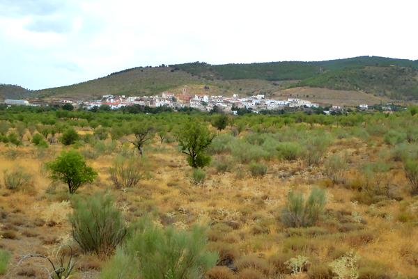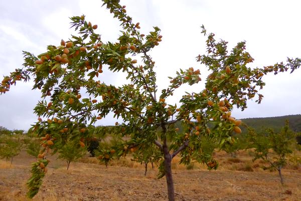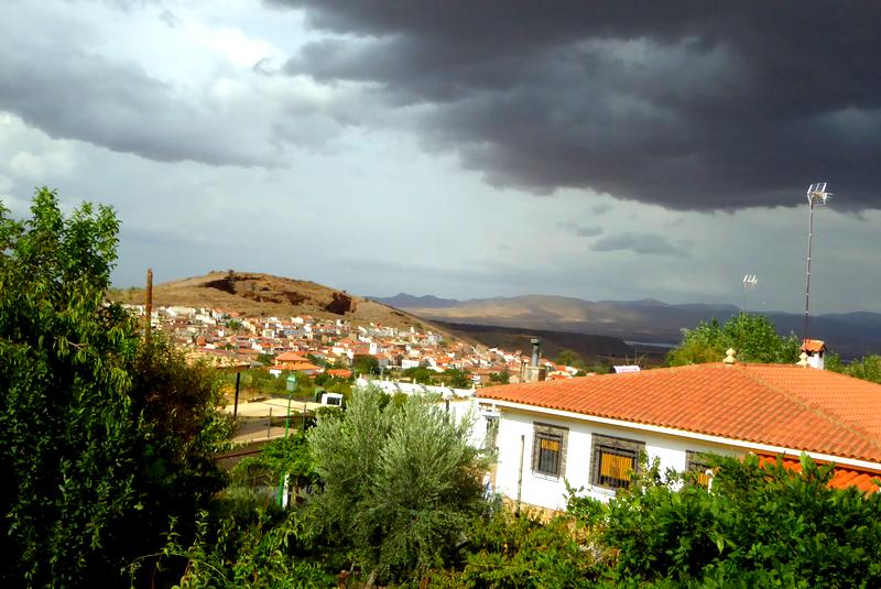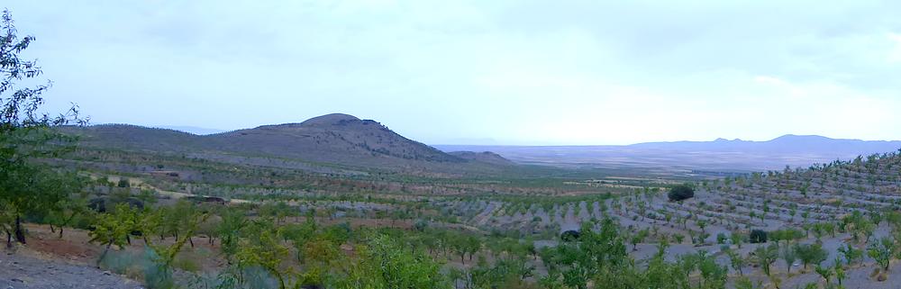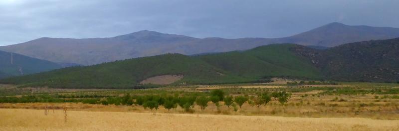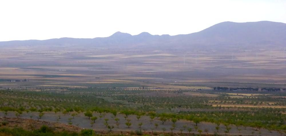 Au premier pueblo, Dolar, je m'arrête dans un bar boire un Coca. Le temps est très nuageux et venteux? Je suis un chemin de terre qui serpente entre les champs d'amandiers qui couvrent les collines... Etonnant de voir tant d'amandiers à une altitude de 1.300 m ! Le panorama tout au long de l'étape est d'une beauté saisissante, d'un côté la