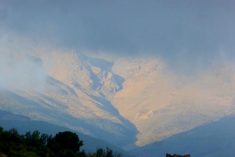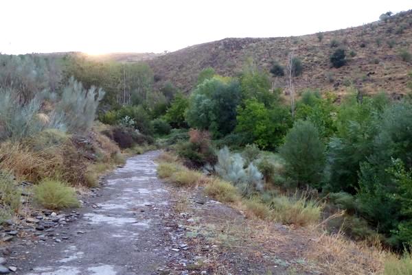 se répercutent au loin ! Je marche sur une longue piste qui côtoie le site minier et qui peu à peu se transforme en un chemin qui descend de manière assez abrupte dans un vallon, puis remonte suivant une pente raide sur 300 à 400m... J'aperçois au loin quelques reflets du soleil qui émerge des nuages sur les sommets de la Sierra Nevada et tout particulièrement la masse du Picón