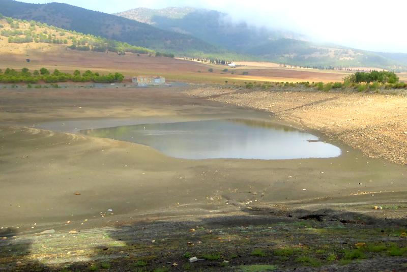 C'est ensuite un chemin agréable qui côtoie un ruisseau, avec un passage sur un petit pont de pierre, puis je chemine un moment sur une piste au milieu des conifères qui répandent une odeur agréable de résine... Cependant que je marche, je ne cesse de contempler les sommets de cette montagne mythique qui secoue peu à peu les nuages pour apparaître dans toute sa majesté ! J'arrive alors à l'Embalse de Cogollos de Guadix avec un barrage construit en 1978, mais en cette fin d'été après plusieurs mois sans pluie, cette réserve d'eau est presque entièrement à sec...Il y a juste un fond d'eau qui constitue comme une grosse mare ! Je ne sais pourquoi, mais le fléchage me fait faire le tour de ce barrage, ce qui rallonge d'au moins un kilomètre !
