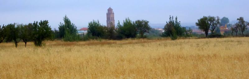 Puis s'en suit un chemin campagnard au milieu de champs de céréales qui ne sont pas encore moissonnés et quelques oliveraies et champs d'amandiers...J'aperçois au loin dominant la campagne la tour-clocher de l'église du prochain pueblo, Cogollos de Guadix. Arrivé dans ce village, je fais une pause dans un bar pour boire un Coca et me reposer un peu. Une fanfare de jeunes gens sort un peu