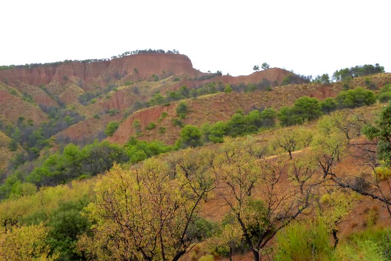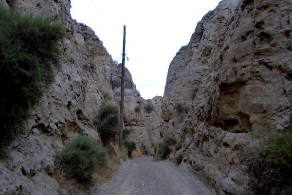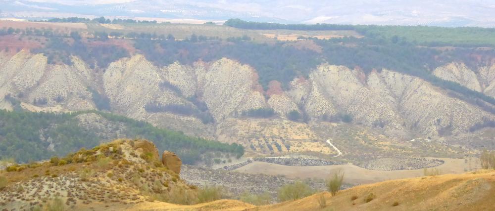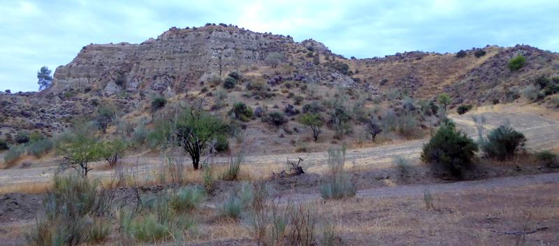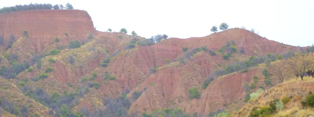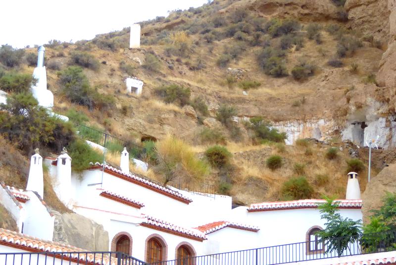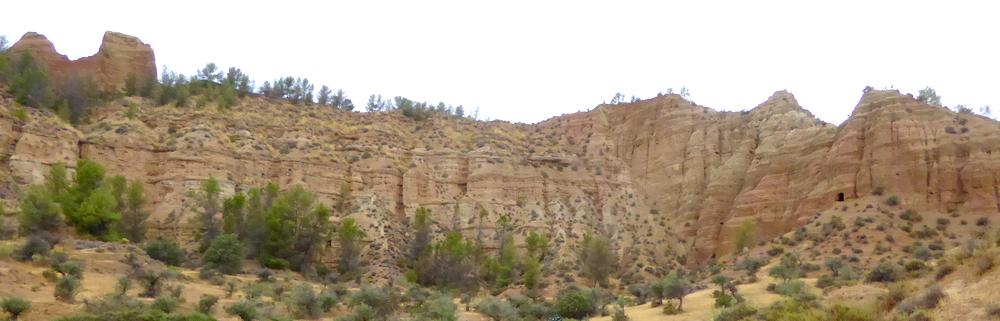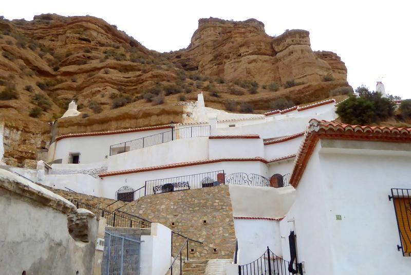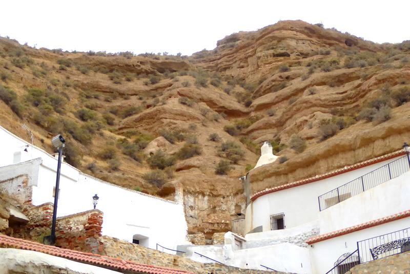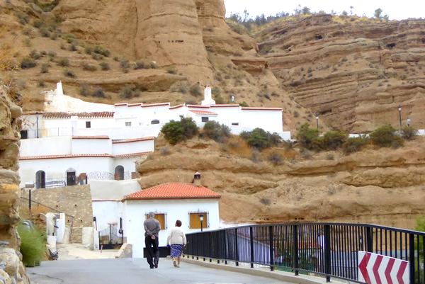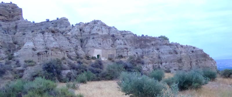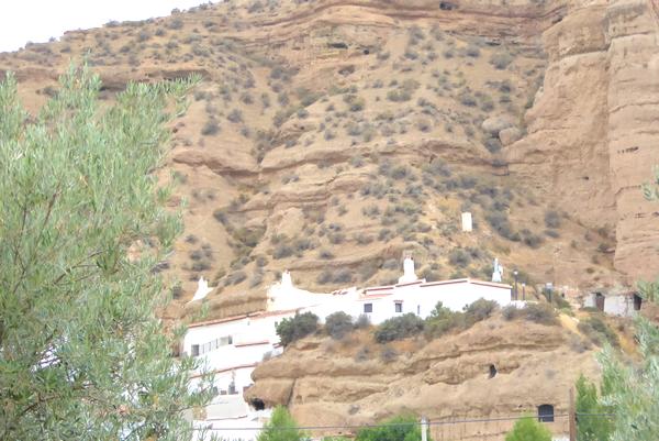 Je quitte mon hébergement à 6h. La traversée de Guadix est assez longue (2km), mais heureusement bien balisée. J'arrive ensuite sur un chemin bordé d'oliviers et de petites propriétés campagnardes. Il fait nuit, les chiens aboient tout le long de mon parcours...Je débouche alors sur un vaste espace dominé par ces rochers aux formes sculptées par l'érosion faite par les mers anciennes dans lesquels nos ancêtres lointains avaient élu domicile dans des habitats sommaires qu'on appelle aujourd'hui maisons troglodytes et qui offrent tout le confort...