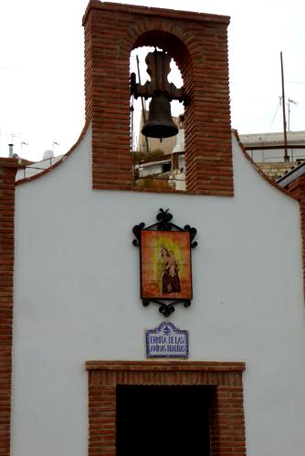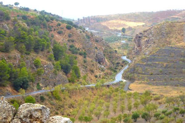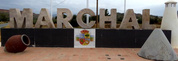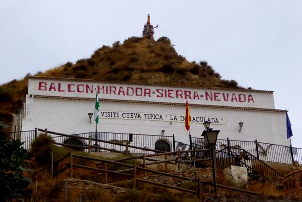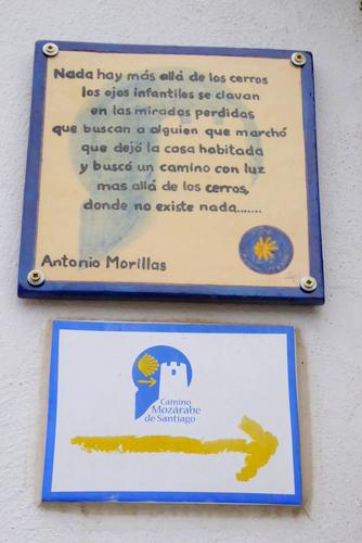 J'arrive au premier pueblo Purullena à l'entrée duquel se trouve un site avec un mirador pour contempler La Sierra Nevada et la visite d'une grotte typique "La Immaculada", mais à cette heure matinale le site est fermé; je vais alors dans un bar où je commande un cafe con leche et une tranche de pain à la tomate avec du jambon (Pour 1 € 80). Après un temps de repos, rafraîchissement des pieds et le plein d'eau fraîche, je passe à l'Ayuntaminto faire tamponner ma Credenciale et je prends alors une petite route bordée d'oliviers qui me conduit tout droit à cet étonnant pueblo qu'est Marchal.