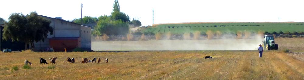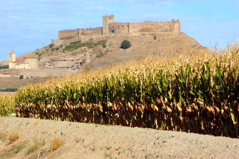 J'ai décidé de ne pas rentrer dans la ville de Don Benito privilégiant ainsi la visite de Medellin. Après le contournement de celle-ci, je vais suivre une piste sableuse et poussiéreuse qui passe dans une zone où s'alternent villas, jardins potagers, oliveraies, quelques pieds de vigne, des vergers, des figuiers et pour finir des champs de maïs.