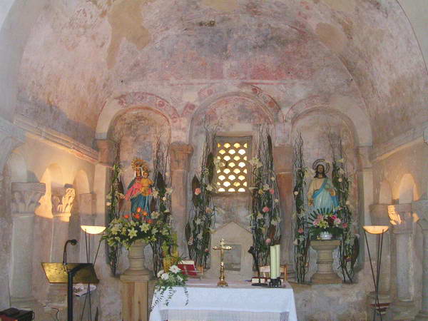 Le chÅ“ur de cette belle église avec des fresques et des motifs sculptés propres au préroman asturien