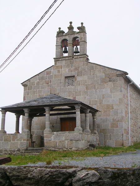 Eglise de Seoane, en granit, avec une rosace de pierre au-dessus du porche