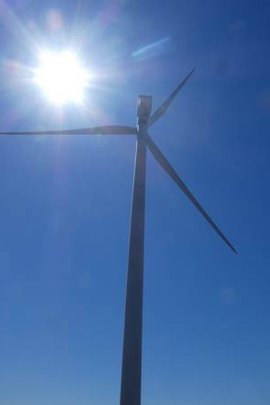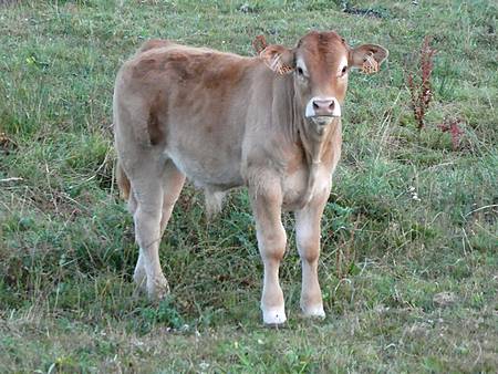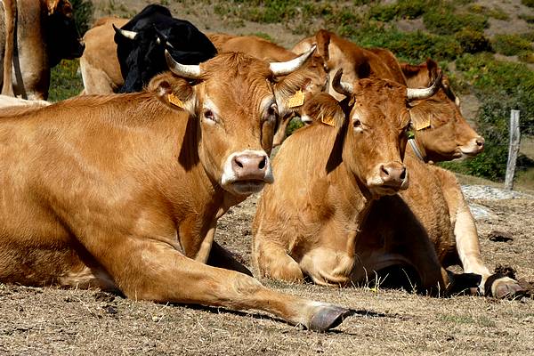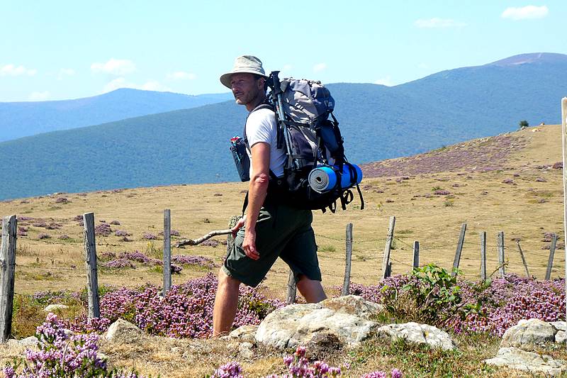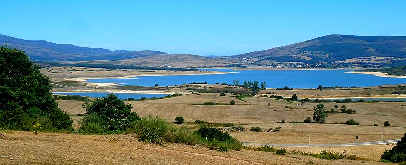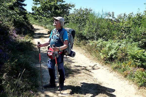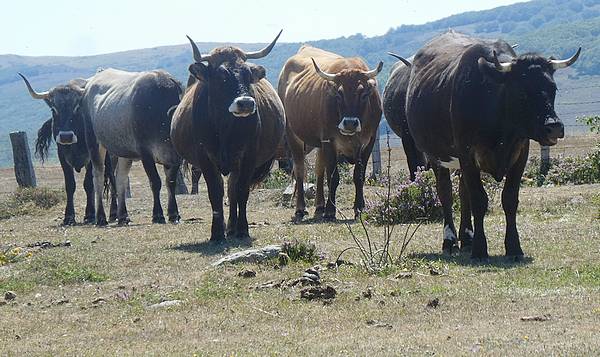 Il commence à faire très chaud et cette variante s'avère plutôt difficile avec des chemins peu ombragés et en pente assez raide. La température en début d'après-midi va monter à plus de 40° au soleil. Nous arrivons à un point haut situé à 1100 m, où se trouve une éolienne qui tourne en émettant un ronflement qui s'entend de loin. Nous croisons des troupeaux de vaches et de moutons... La végétation sur ces hauts plateaux est principalement constituée de massifs de genêts et de bruyères.