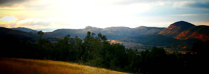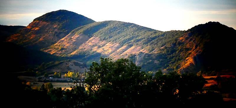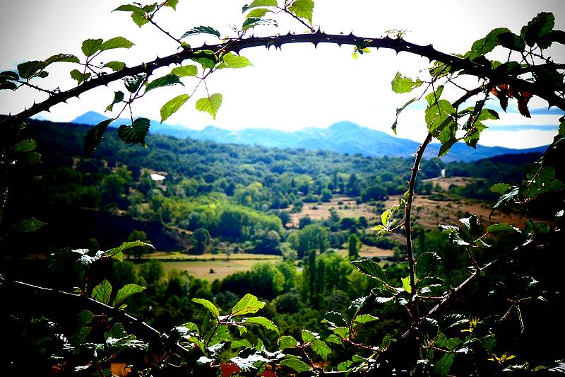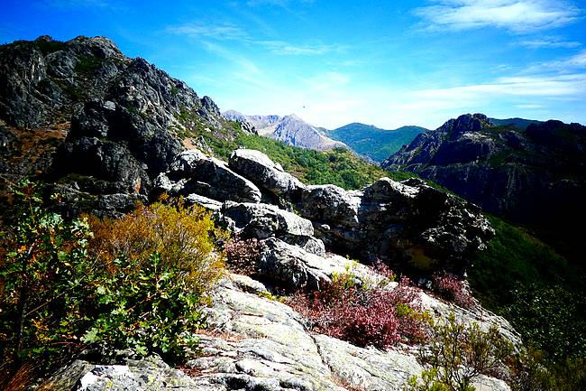 J'arrive alors sur un espace découvert d'où j'ai une superbe vue sur les montagnes alentour. La vue de tous les côtés est sublime ! Je prends ensuite un sentier au milieu des genêts et des églantiers qui descend en pente douce. Je fais alors une longue pause...