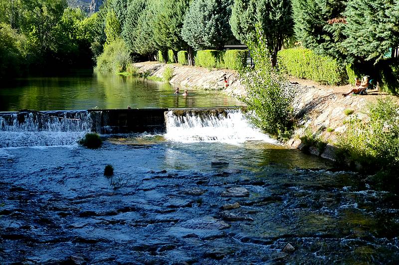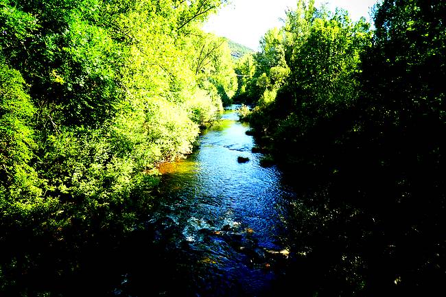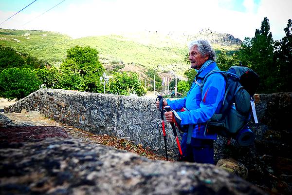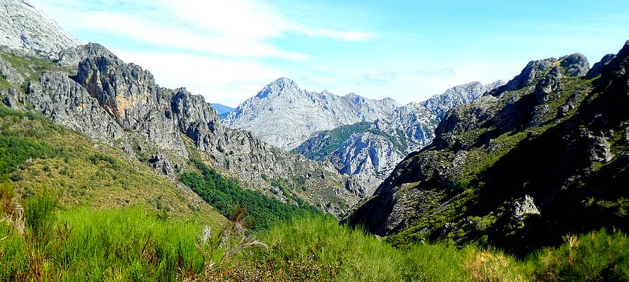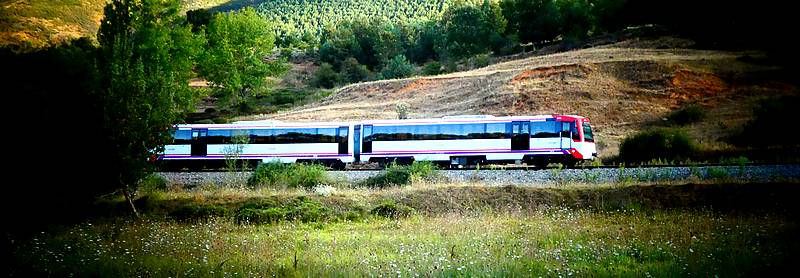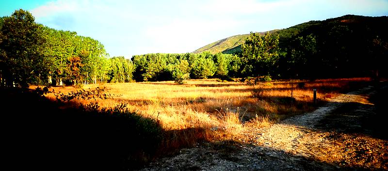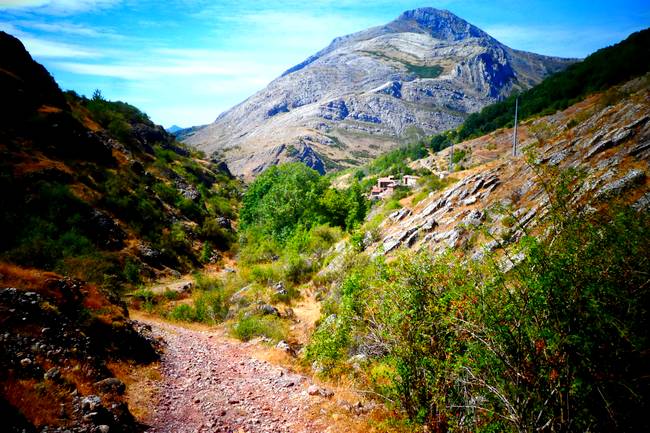 Je suis sur le chemin à 7h, après avoir pris un petit déjeuner dans un bar qui par chance était ouvert à 6h30. Je franchis le Pont Vieux sur le Rio Porma et je prends un petit chemin qui longe la rivière puis s'en éloigne pour grimper doucement. Cheminement agréable assez proche de la voie ferrée où passe le petit train de la montagne qu'on entend de loin quand il émet un signal et dont le broun-roun-roun des roues s'amplifie en s'approchant du chemin.