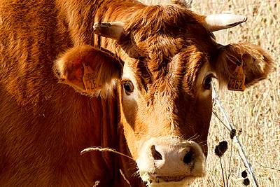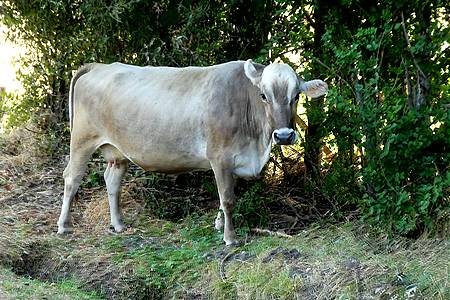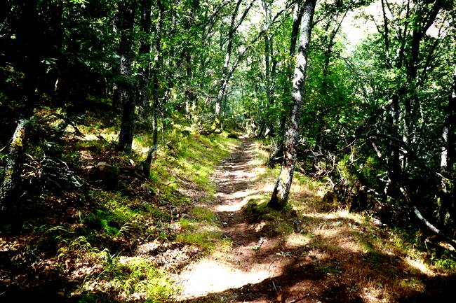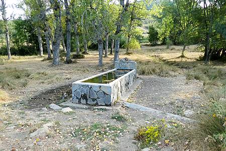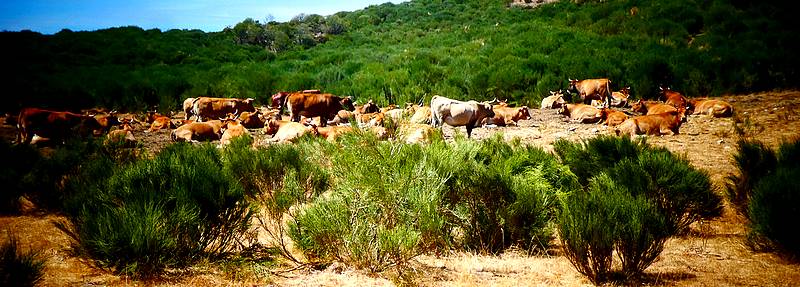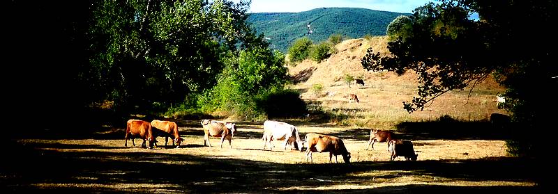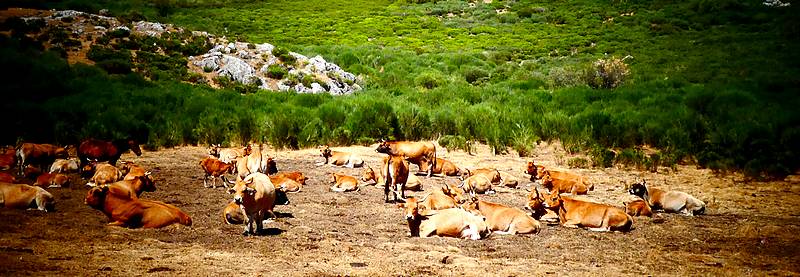 par un chemin défoncé qui m'emmène à un alpage où il y a un grand troupeau de vaches. Je traverse ensuite une mini-forêt de genêts et j'arrive à un grand abreuvoir. Le chemin continue à descendre jusqu'au prochain pueblo, Correcillas.