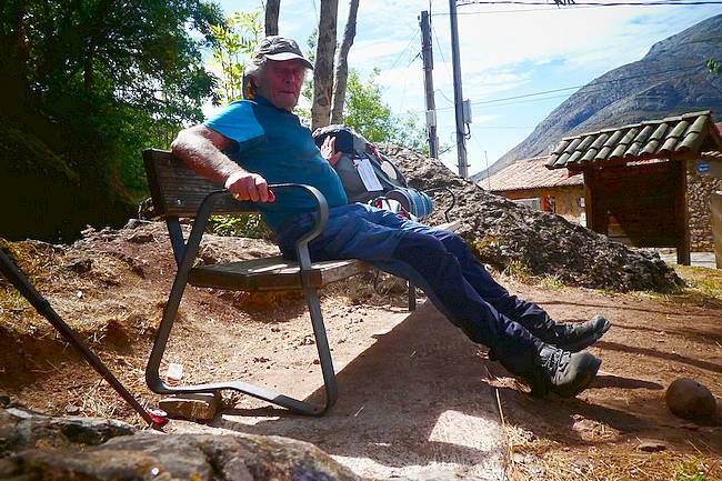Ensuite, ça grimpe à nouveau jusqu'à une alitude de 1484 m. Il reste alors à peu près 10 km en descente dont une grande partie sur une petite route dans un vallon verdoyant. J'arrive après 11h de marche (- les pauses) à Vegacervera où je vais directement à mon hébergement l'Albergue "El Chaltén" où je suis logé dans un chalet en bois...