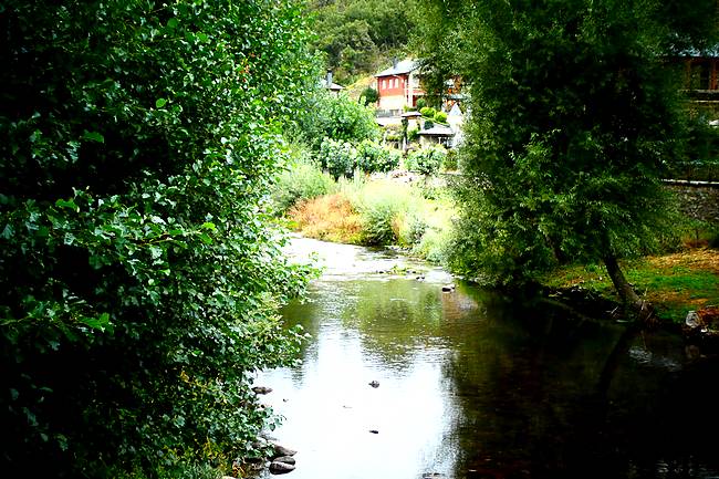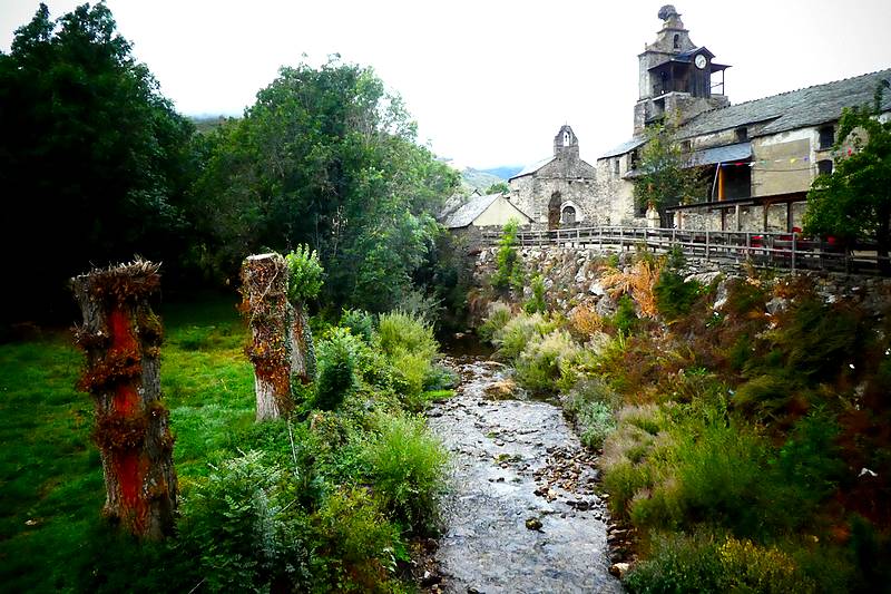 rivière (Rio Omaña) que je vais suivre pendant une partie de l'étape. Le temps est nuageux et il est prévu de la pluie. Je prends un chemin qui va traverser la rivière près d'un 2ème village, Guisatecha, et va