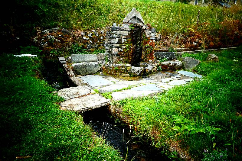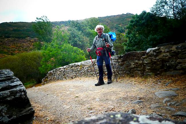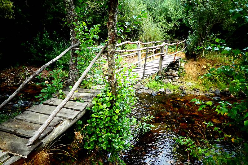 j'arrive au 11ème village, Posada. Je continue en suivant un joli chemin entouré de murets. Je traverse la rivière sur de grosses pierres et je