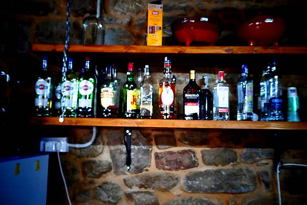 l'étagère sur laquelle se trouvent une quinzaine de bouteilles d'alcool...