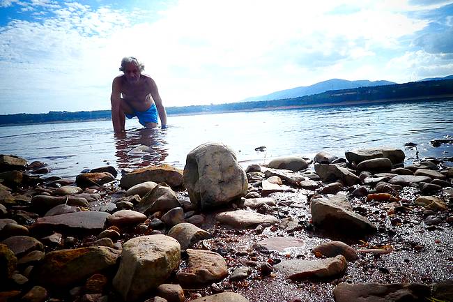 Je continue, et à un moment, me voyant tout près du lac, je décide d'aller me baigner. La descente est caillouteuse,