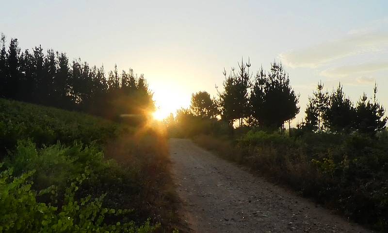 Je quitte l'albergue à 7h et je suis une route pour quitter cette zone industrielle où se trouve l'albergue alors qu'il fait encore nuit. J'arrive au village de Cabañas Raras quand le jour se lève. À partir de là, je vais suivre un chemin de terre un peu caillouteux qui passe au milieu d'une belle végétation. Il y a des sapins, des peupliers et une grande variété d'arbres fruitiers, figuiers, pommiers, poiriers, cerisiers et beaucoup de cultures maraîchères. Mais ce qui va prédominer tout au long de l'étape ce sont les vignobles du Bierzo.