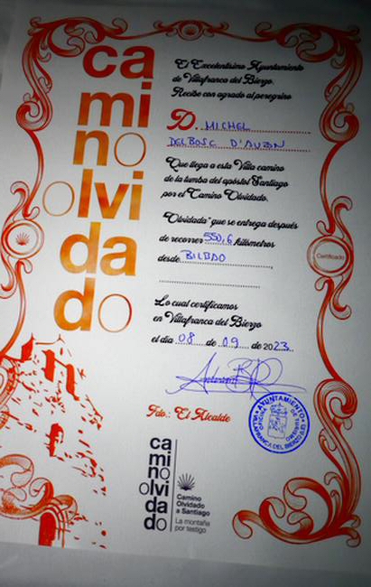 Après un temps de repos, je vais à l'Office du Tourisme recevoir le certificat délivré par le Maire (El Alcalde) attestant que j'ai parcouru les 550 km du Camino Olvidado (Voir Photo).