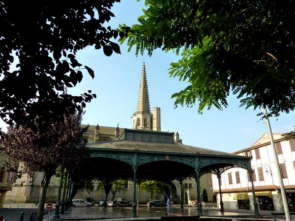 Les Halles avec en fond, le clocher de la Cathédrale Saint-Maurice de Mirepoix.