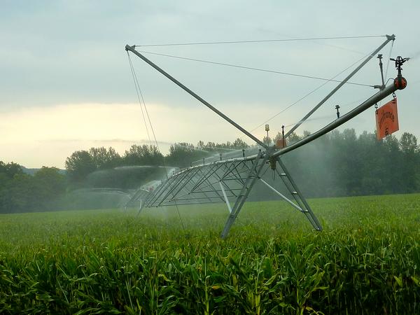 Un peu avant Saint Amadou, je traverse une vaste plaine où les champs de maïs sont arrosés avec