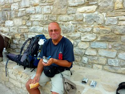 Franz, pèlerin autrichien prend son petit-déjeuner.