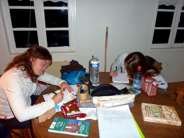 Le soir, au gîte de Asson les 2 pèlerines suisses absorbées dans la rédaction de leur carnet de pèlerinage.