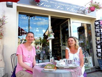 Dominique, une pèlerine avec Sylvie devant la boutique "Sur le Chemin"