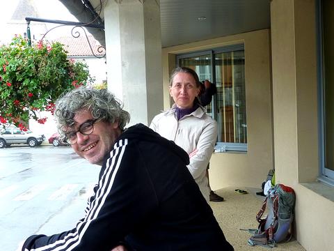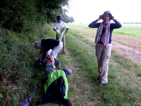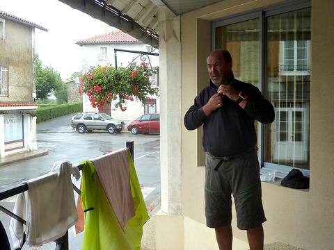 Arrivés à Saint-Sauvant, on trouve un abri pour se mettre un peu au sec...